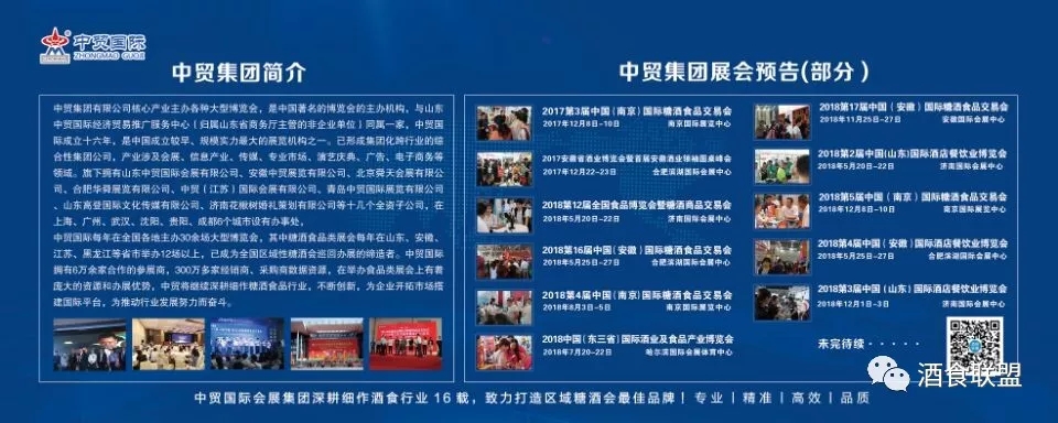中貿(mào)集團(tuán)2018年計(jì)劃將在山東濟(jì)南、安徽合肥、江蘇南京、黑龍江哈爾濱、浙江杭州等省市舉辦十余場(chǎng)次酒博會(huì)、食品展、餐飲展,形成聯(lián)動(dòng)招商、資源互動(dòng)和共享。