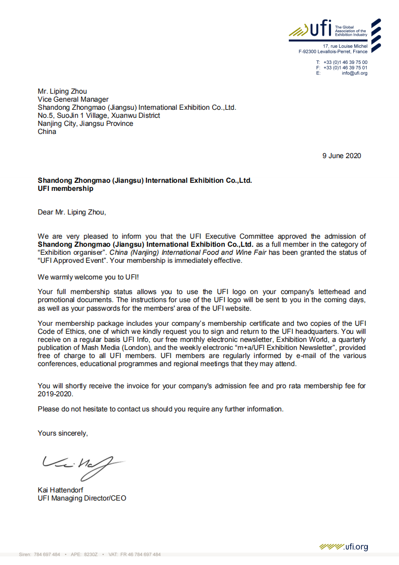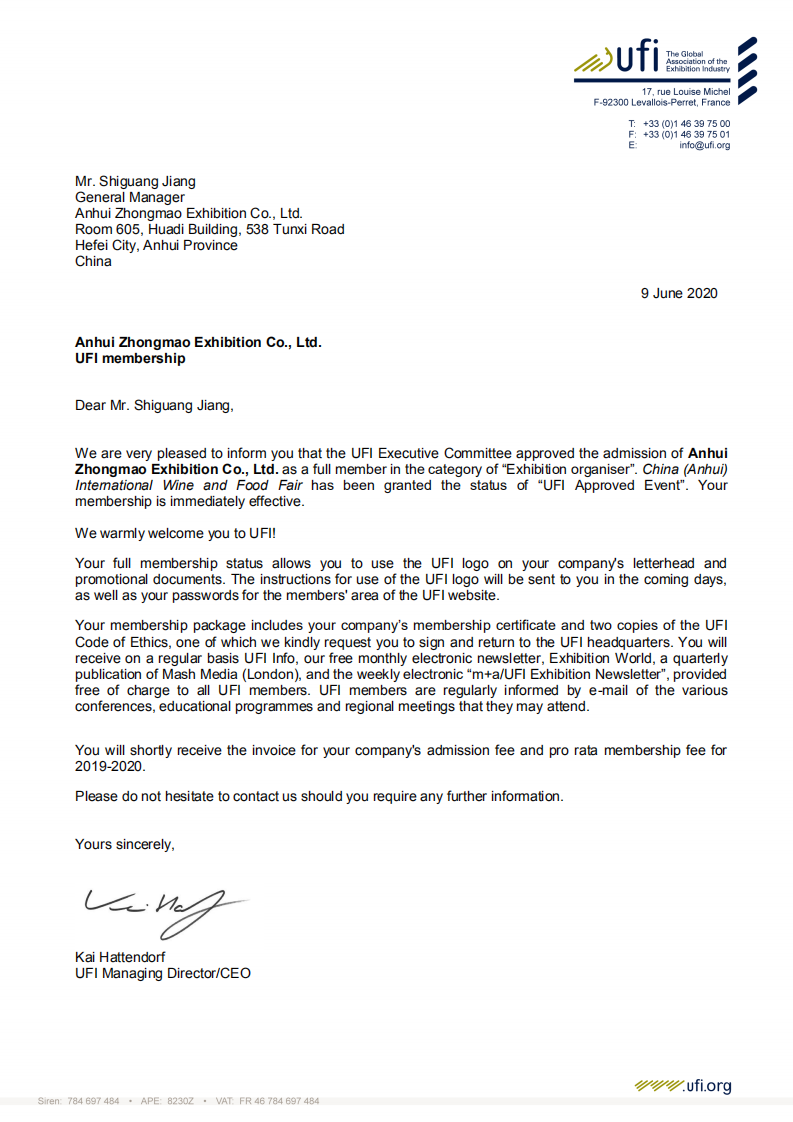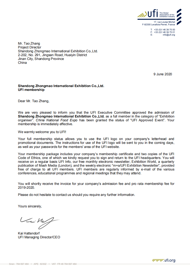 2020年6月9日,UFI(全球展覽業(yè)協(xié)會)巴黎總部傳來喜訊:中法合資高博中貿(mào)會展在山東、江蘇、安徽主辦的CNFE全國食品博覽會(濟南)、CNWFF中國(南京)國際糖酒食品交易會、CAWFF中國(安徽)國際糖酒食品交易會三展同時通過UFI(全球展覽業(yè)協(xié)會)認證,同時高博中貿(mào)會展在山東、江蘇、安徽三個子公司也通過UFI評審委員會的表決,分別正式成為UFI(全球展覽業(yè)協(xié)會)會員單位。通過UFI認證,是國際會展行業(yè)對主、承辦單位組織辦展能力的肯定,對展會在國際化、專業(yè)化、品牌化運營方面的充分認可。借助UFI認證展會的權(quán)威和影響,努力提升展會平臺新高度,助推會展經(jīng)濟的快速發(fā)展。